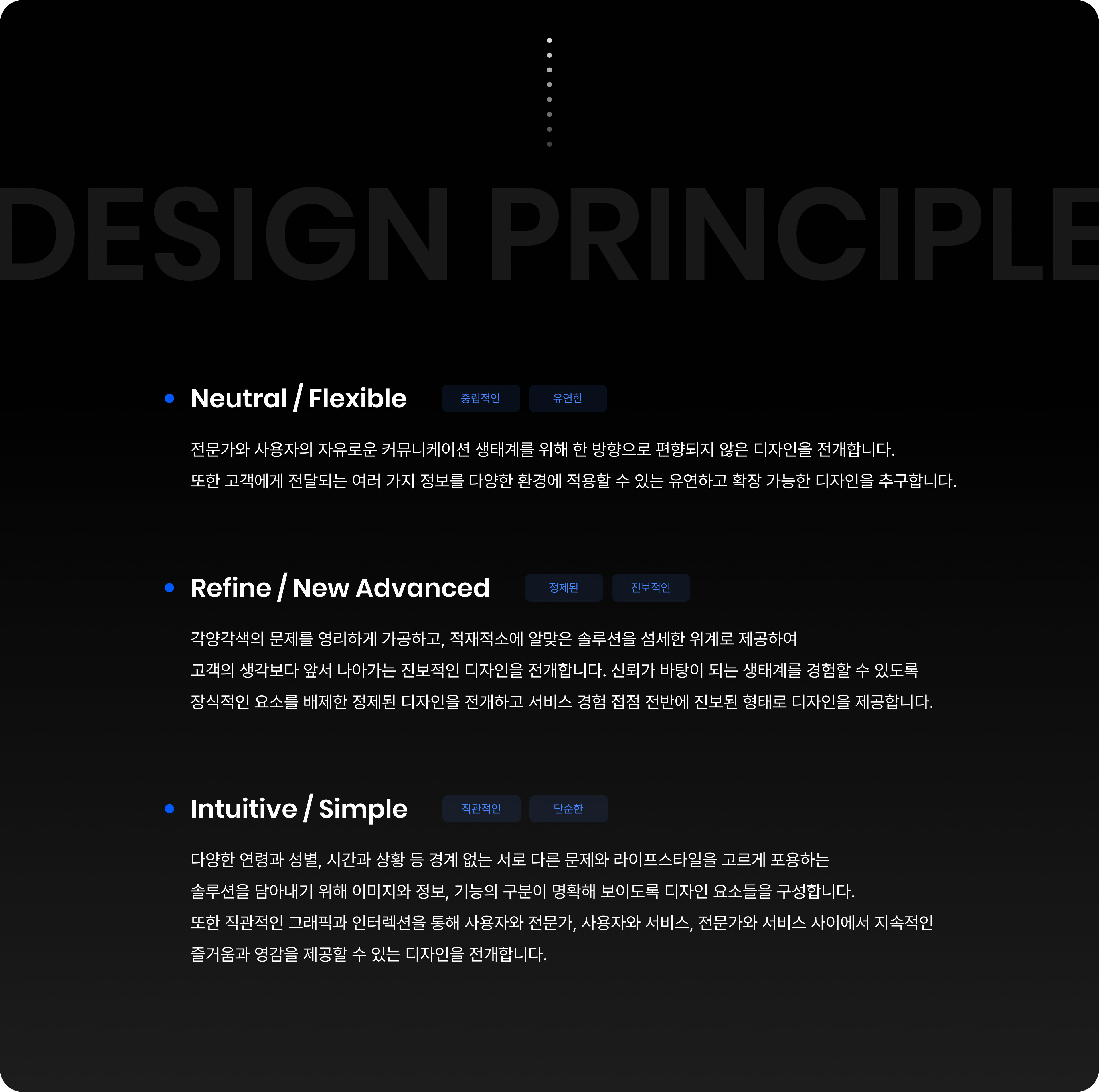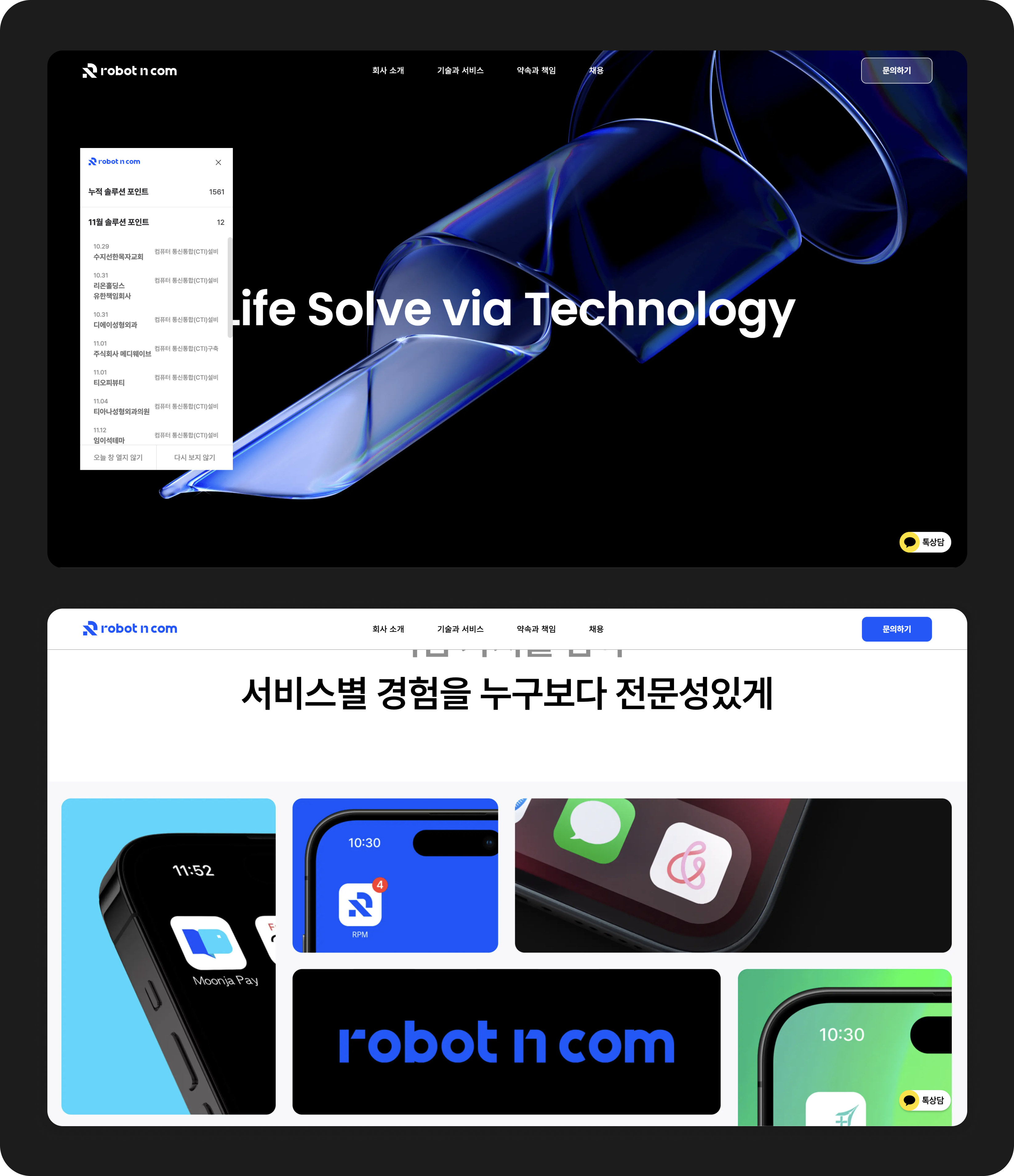 새롭게 정의된 로봇앤컴(Robot N Com)의 브랜드 정체성은 ‘기술 전문성'이라는 문제 해결 경험을 통한 보상을 직접적으로 설명하며, ‘일상의 문제'라는 일상적 표현을 통해 브랜드가 지향하는 편리하고 신뢰할 수 있는 이미지를 전달합니다.