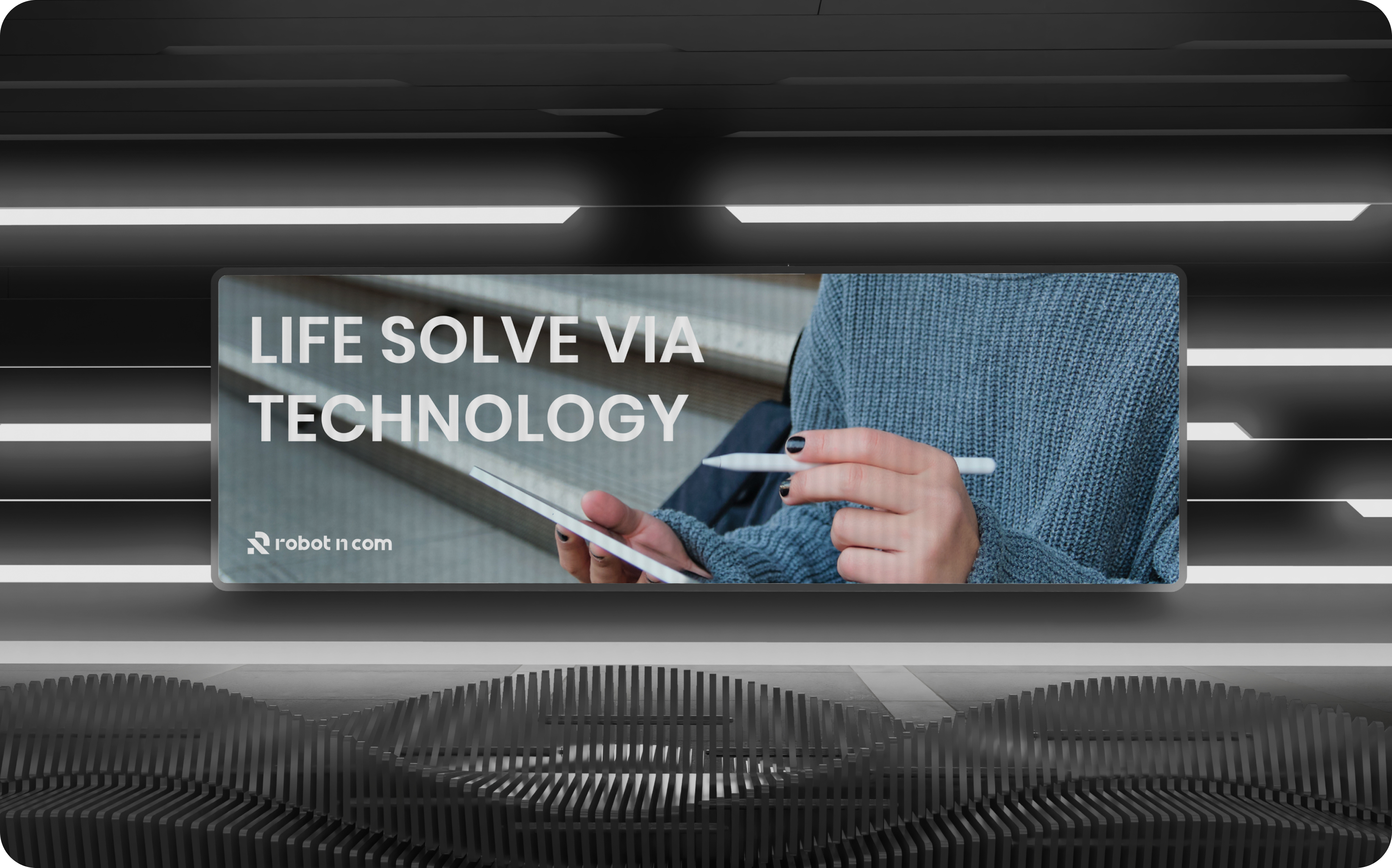 로봇앤컴(Robot N Com)의 새로운 브랜드 슬로건은 브랜드의 철학이자 행동 방침으로써 브랜드가 가고자 하는 방향을 제시하며 이를 ‘Life Solve via Technology(기술을 통해 일상의 문제를 해결합니다.)’로 정의합니다. 이 슬로건은 종합 IT 솔루션 플랫폼이 추구하는 핵심 철학으로, 브랜드 핵심 가치와 업의 본질적 정의를 반영합니다. 브랜드의 존재 이유이자 목소리이며, 기업과 관련된 모든 활동의 기준이 되는 개념으로써 브랜드가 가고자하는 방향을 제시하는 데 사용됩니다.