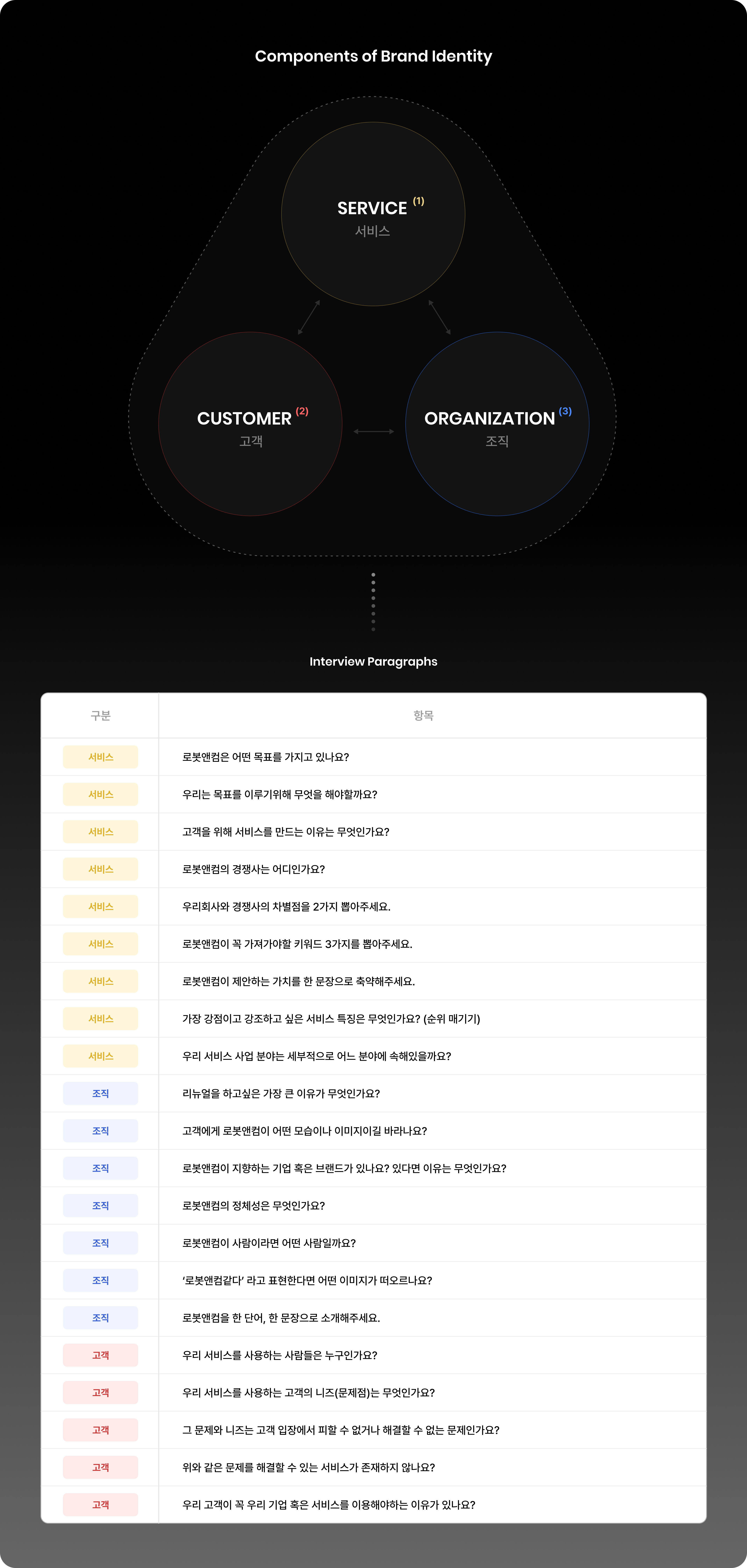 로봇앤컴(Robot n Com) 전반의 이해를 바탕으로 로봇앤컴 업의 정의, 페인포인트, 솔루션 등을 포함한 Key Question을 정립하여 CEO와 심층 인터뷰(In-Depth-Interview)를 진행하였습니다. Key Question에 대한 구체적이고 설득력있는 인사이트를 도출하였으며, 이를 통해 로봇앤컴의 존재 이유가 무엇인지 규정하였습니다.