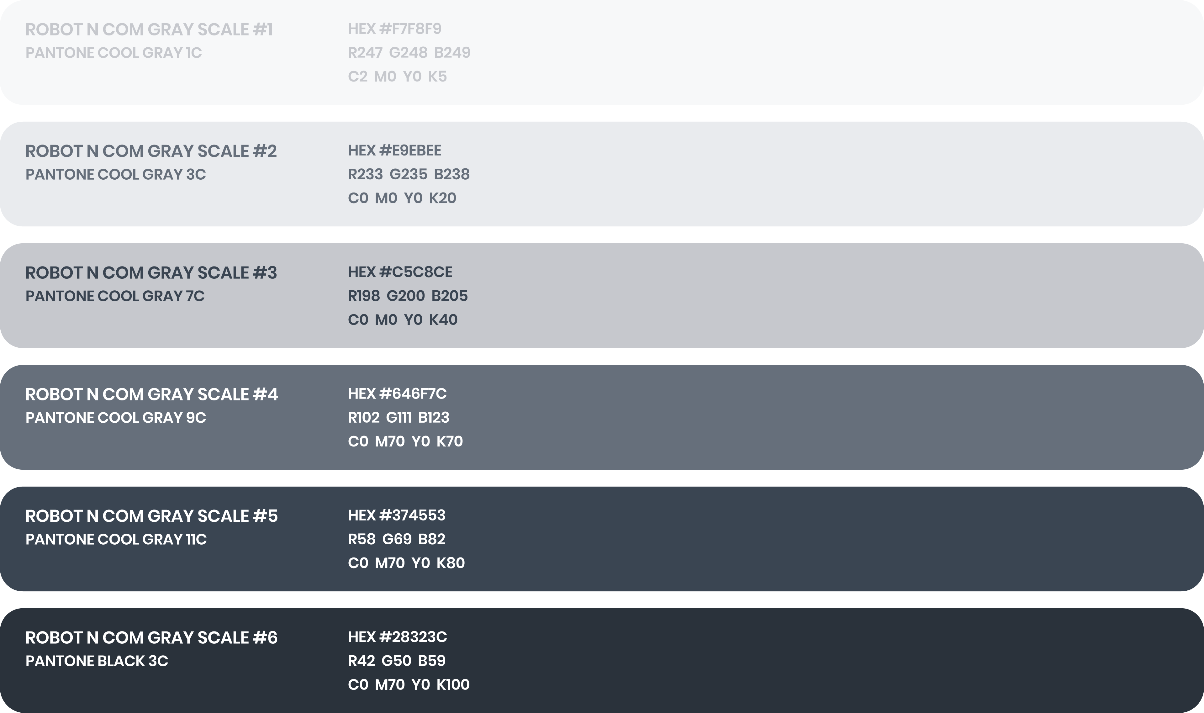 서체는 사용자들에게 로봇앤컴의 이야기를 전달하는 역할을 하며 일관된 서체의 사용은 강력한 브랜드 성격을 만듭니다. 다양한 무게의 서체, 정보의 명료한 위계 등 타이포그래피의 올바른 활용은 로봇앤컴 더욱 신뢰할 수 있는 브랜드로 만들어 줍니다.
